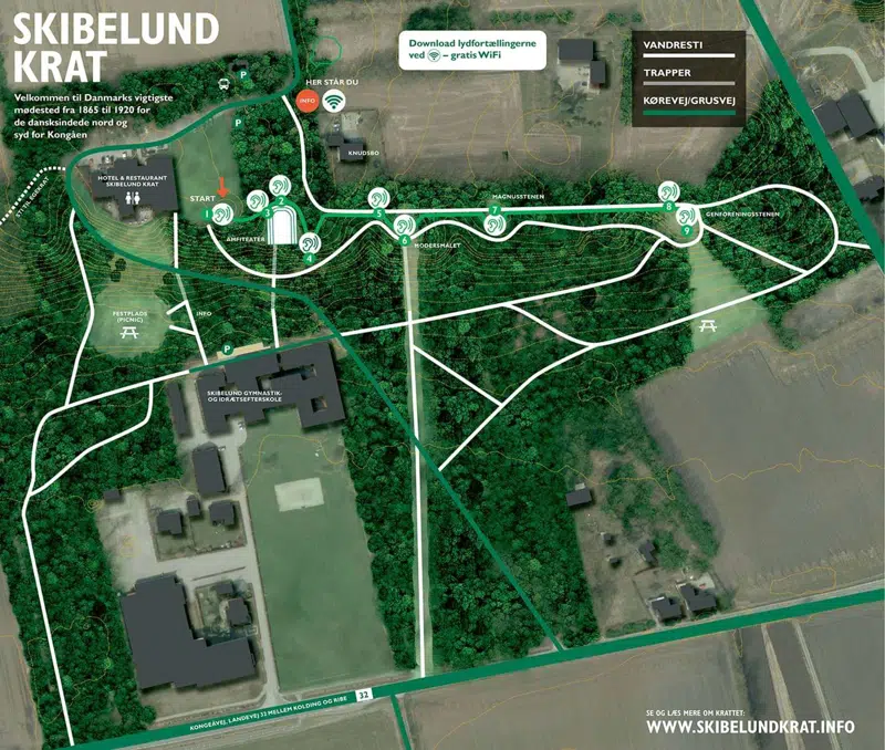 Her kan du se et oversigtskort over Skibelund Krat. Her er stier, trapper og grusveje markeret foruden de monumenter, der er knyttet en lydfortælling til. Der er borde-bænkesæt på Festpladsen og toiletter på Hotel Skibelund Krat. Du kan hente lydfortællingerne ned på din telefon via gratis wifi ved infopunktet og nyde dem off-line i hele Skibelund Krat.