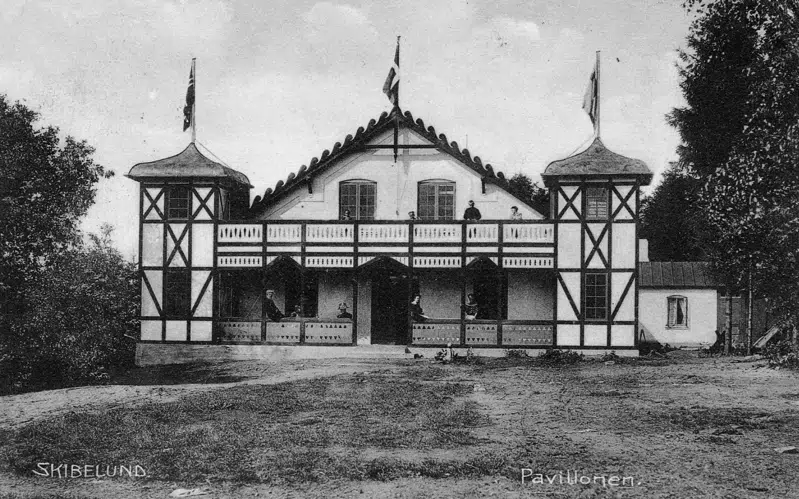 Skibelund Pavillonen i sin første skikkelse, 1909. Pavillonen blev opført af Skibelundforeningen i 1908 og forpagtet bort til en restauratør.