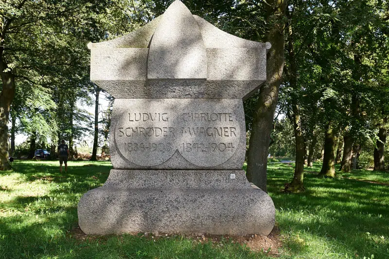 Det var oplagt, at stenen til minde om en af hoveddrivkræfterne i etableringen af det historiske anlæg skulle stå centralt i festpladsens midterakse. Den monumentale mindesten er udført efter tegninger af Joakim Skovgaard, en af højskolens foretrukne kunstnere. Han har også malet de portrætter af forstanderparret, der hænger i Schrøders Stue på Askov Højskole.