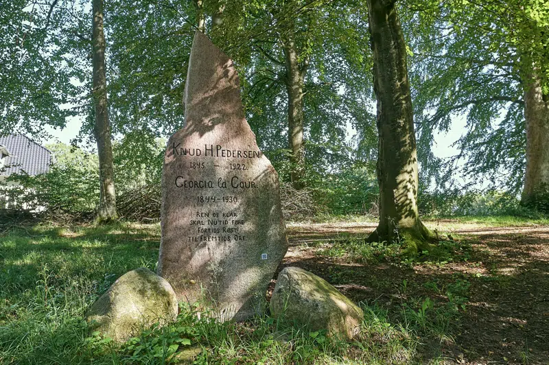 Mindestenen for ægteparret og deres virke blev bestilt hos billedhugger Niels Hansen Jacobsen. Stenens vers er forfattet af Svend Grundtvig: Ren og klar skal nutid føre – fortids røst til fremtids