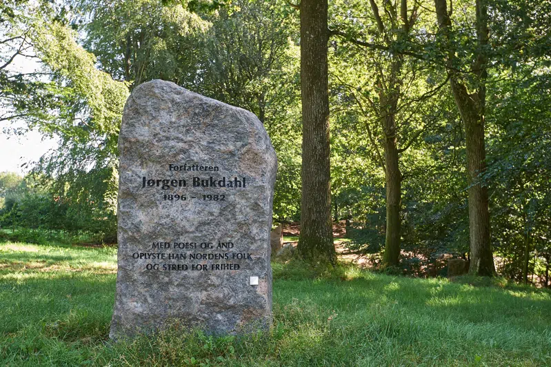 Jørgen Bukdahl var forfatter og hyppig gæsteforelæser på Askov Højskole. Stenen skiller sig ud fra de andre sten omkring pladsen, idet Bukdahl ikke var en del af samme kreds og sag som de øvrige.