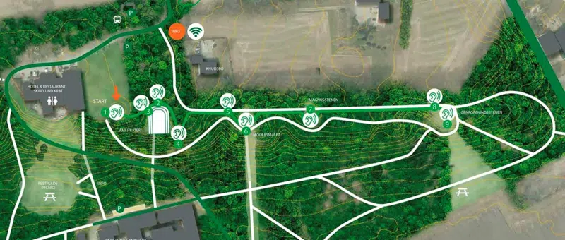 Du finder også lydfortællingerne i VisitVejen Appen, som du henter i App Store og Google Play. I VisitVejen Appen ligger lydvandringen under fanen Skibelund Krat. Du starter den enkelte fortælling ved at trykke på “øre-ikonet”, når du står foran de enkelte sten. Hvis du tager et par hovedtelefoner med på tur, bliver det en endnu bedre oplevelse.
