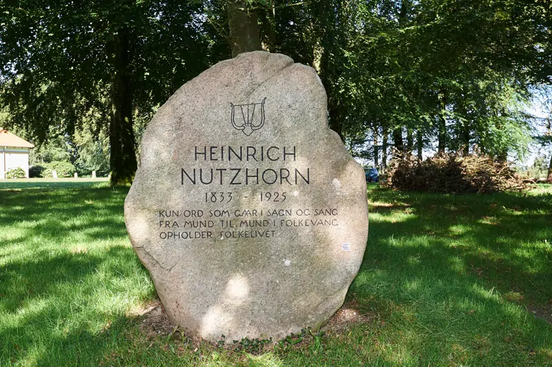 Du står nu ved Heinrich Nutzhorns sten. Heinrich Nutzhorn regnes for at være én af skaberne af Højskolesangbogen. Det var Nutzhorn, som i en lang årrække stod for fællessangen her i Krattet, og som du kan læse på hans sten, så står der: